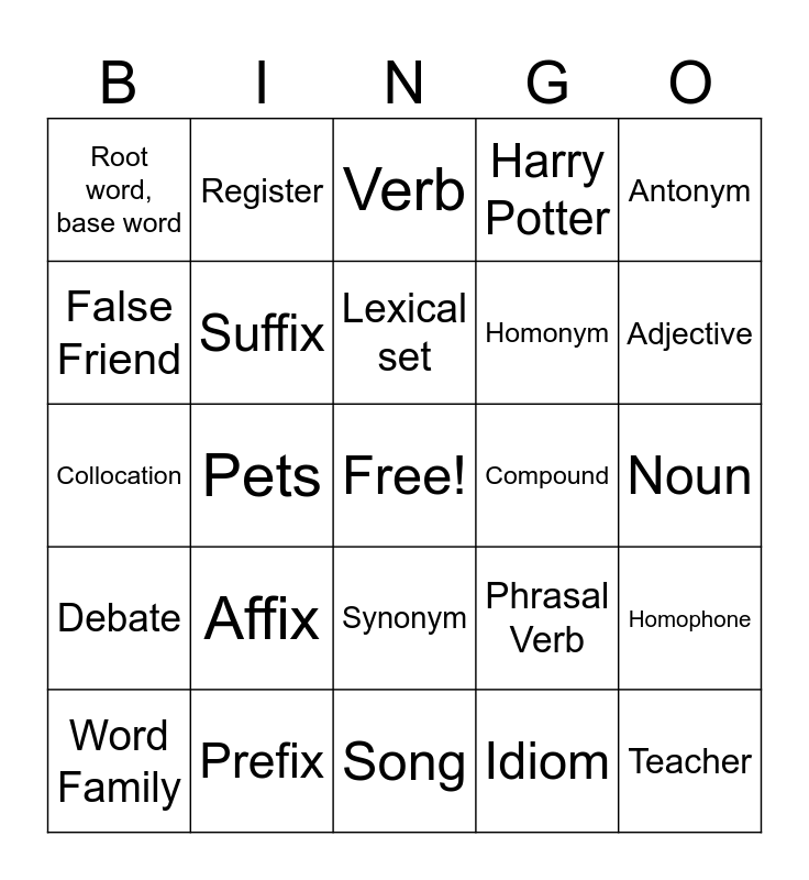 This bingo card has a free space and 24 words: Affix, Prefix, Lexical set, Word Family, Antonym, Root word, base word, False Friend, Register, Compound, Synonym, Homonym, Collocation, Phrasal Verb, Homophone, Suffix, Idiom, Noun, Verb, Adjective, Pets, Teacher, Debate, Harry Potter and Song.