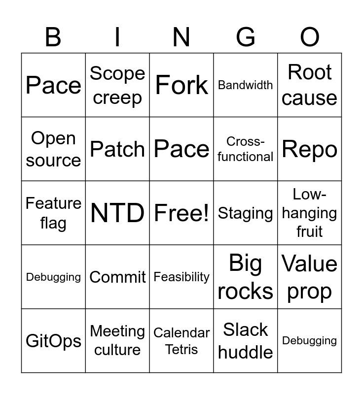 This bingo card has a free space and 147 words: Circle back, Unpack, Lean-in, NTD, Scope creep, Big rocks, Workstream, Alignment, Prioritize, Roadmap, Capacity planning, Low-hanging fruit, Retrospective, Stakeholder buy-in, Dependencies, Action items, Cross-functional, PMO framework, Outcomes vs. Outputs, Blockers, Feasibility, Value prop, Circle back, Unpack, Lean-in, NTD, Scope creep, Big rocks, Workstream, Alignment, Prioritize, Roadmap, Capacity planning, Low-hanging fruit, Retrospective, Stakeholder buy-in, Dependencies, Action items, Cross-functional, PMO framework, Outcomes vs. Outputs, Blockers, Feasibility, Value prop, Business case, North Star Metric, Async, Ship it!, MVP, Rollback, Tech debt, Open source, GitOps, Merge conflicts, Pull request, Issue tracking, Copilot, Code ze, CI/CD, Revert, Fork, Patch, Commit, Octocat, Repo, Staging, Debugging, Root cause, API-first, Feature flag, Version control, Tempo, Pace, Plug-in, Zoom fatigue, Slack huddle, Remote-first, Virtual whiteboard, Deep work, Bandwidth, Over-communication, Digital body language, Distributed team, Always-on culture, Time zones, Work-life integration, Collaboration tool, Cameras off, You're on mute, Calendar Tetris, Focus time, Async updates, Hybrid flexibility, Virtual watercooler, Meeting culture, Touch baseBusiness case, North Star Metric, Async, Ship it!, MVP, Rollback, Tech debt, Open source, GitOps, Merge conflicts, Pull request, Issue tracking, Copilot, Code ze, CI/CD, Revert, Fork, Patch, Commit, Octocat, Repo, Staging, Debugging, Root cause, API-first, Feature flag, Version control, Tempo, Pace, Plug-in, Zoom fatigue, Slack huddle, Remote-first, Virtual whiteboard, Deep work, Bandwidth, Over-communication, Digital body language, Distributed team, Always-on culture, Time zones, Work-life integration, Collaboration tool, Cameras off, You're on mute, Calendar Tetris, Focus time, Async updates, Hybrid flexibility, Virtual watercooler, Meeting culture and Touch base.