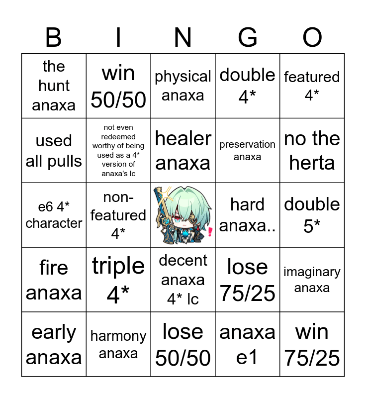 This bingo card has a free space and 24 words: early anaxa, triple 4*, healer anaxa, anaxa e1, featured 4*, the hunt anaxa, win 50/50, physical anaxa, hard anaxa.., double 5*, e6 4* character, not even redeemed worthy of being used as a 4* version of anaxa's lc, lose 75/25, imaginary anaxa, used all pulls, harmony anaxa, lose 50/50, double 4*, no the herta, fire anaxa, non-featured 4*, decent anaxa 4* lc, preservation anaxa and win 75/25.