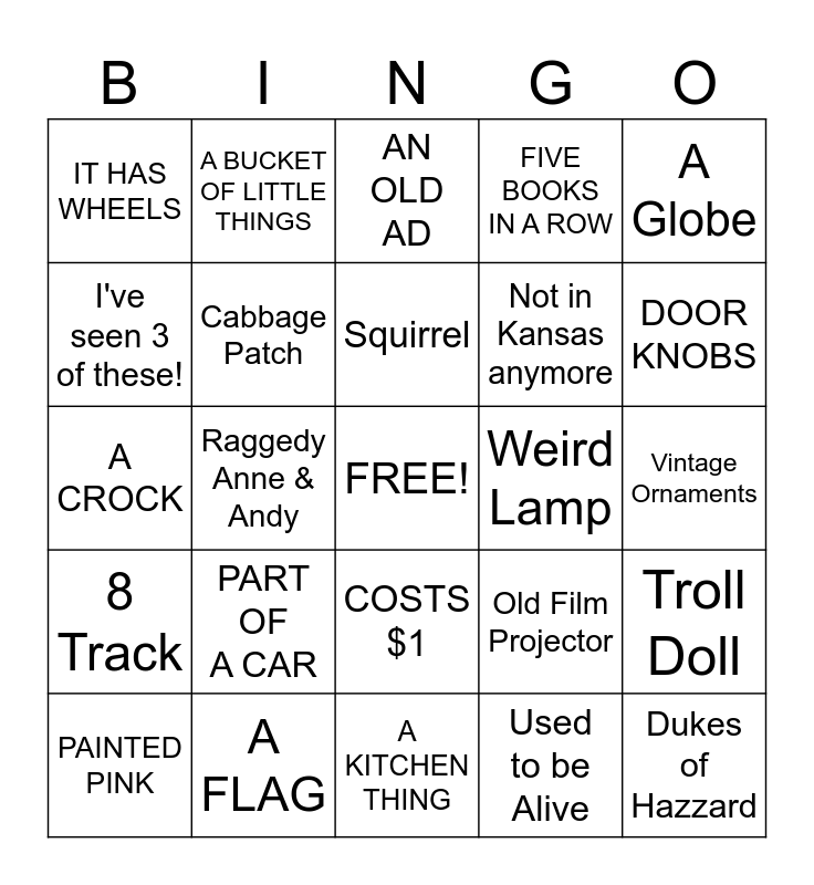 This bingo card has a free space and 44 words: A RUSTY THING, Dukes of Hazzard, COSTS MORE THAN $100, PAINTED PINK, Fishing Gear, Used to be Alive, AN OLD AD, WHAT IS THAT?, A Globe, A FLAG, FIVE BOOKS IN A ROW, Weird Lamp, COSTS $1, PART OF A CAR, AN OLD TOOL, A KITCHEN THING, COCA- COLA, A CROCK, A BELL, DOOR KNOBS, A BUCKET OF LITTLE THINGS, Vintage Typewriter, A FURRY THING, IT HAS WHEELS, Odd Jesus, Vintage Ornaments, Darth Vader, Culturally Questionable, Old Film Projector, 8 Track, Gnome, Troll Doll, 1960's Magazine, Ice Skates, Raggedy Anne & Andy, Old Photograph, Cowboy Figure, Peacock Feather, Squirrel, I've seen 3 of these!, Not in Kansas anymore, Lunchbox, Cabbage Patch and Kool-Aid Cups.