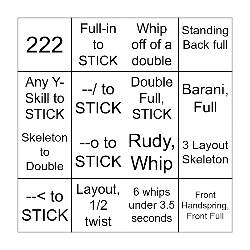 This bingo card has 16 words: Layout, 1/2 twist, 3 Layout Skeleton, Whip off of a double, 222, Skeleton to Double, Full-in to STICK, Rudy, Whip, 6 whips under 3.5 seconds, Any Y-Skill to STICK, --/ to STICK, --< to STICK, Standing Back full, --o to STICK, Barani, Full, Double Full, STICK and Front Handspring, Front Full.