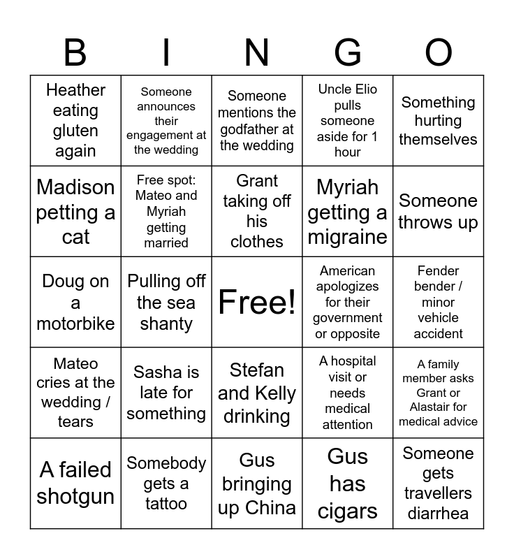 This bingo card has a free space and 25 words: Sasha is late for something, Gus bringing up China, Grant taking off his clothes, A failed shotgun, Something hurting themselves, Heather eating gluten again, Madison petting a cat, Someone announces their engagement at the wedding, American apologizes for their government or opposite, Stefan and Kelly drinking, Myriah getting a migraine, Doug on a motorbike, A hospital visit or needs medical attention, A family member asks Grant or Alastair for medical advice, Free spot: Mateo and Myriah getting married, 16. Someone breaks the dress code at the wedding, Fender bender / minor vehicle accident, Someone mentions the godfather at the wedding, Someone throws up, Pulling off the sea shanty, Someone gets travellers diarrhea, Somebody gets a tattoo, Mateo cries at the wedding / tears, Uncle Elio pulls someone aside for 1 hour and Gus has cigars.