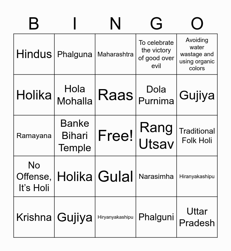 This bingo card has a free space and 48 words: A day before Holi, Uttar Pradesh, Festival of colors, Hiryanyakashipu, Holika, Dola Purnima, Phalguna, Lord Vishnu, Holika, Spring, Hola Mohalla, To celebrate the victory of good over evil, Hiranyakashipu, Narasimha, Holika Dahan, Thandai, Raas, Rang Utsav, Braj ki Holi, Avoiding water wastage and using organic colors, Banke Bihari Temple, Phalguni, Hindus, Dola Purnima, Lord Vishnu, Gujiya, Krishna, Rajasthan, Gulal, No Offense, It’s Holi, Marigold, Symbol of Friendship, Holika, Rajasthan, Gujiya, Kathak, Winter, Traditional Folk Holi, Matki Phod Holi, Dhol, Victory of Good over Evil, Dhoti-Kurta, Maharashtra, Dhol, Ramayana, Peacock, Red and Garba.