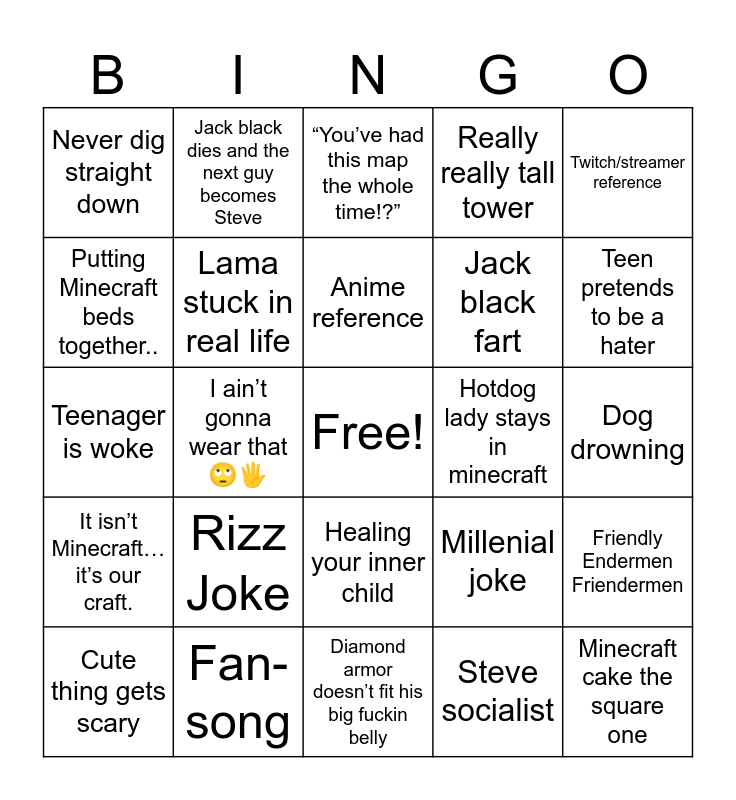 This bingo card has a free space and 24 words: Rizz Joke, Fan-song, Anime reference, Cute thing gets scary, Twitch/streamer reference, Never dig straight down, Putting Minecraft beds together.., Jack black dies and the next guy becomes Steve, Hotdog lady stays in minecraft, Healing your inner child, Jack black fart, Teenager is woke, Millenial joke, Friendly Endermen Friendermen, Lama stuck in real life, Steve socialist, Dog drowning, “You’ve had this map the whole time!?”, Teen pretends to be a hater, I ain’t gonna wear that🙄🖐️, Minecraft cake the square one, It isn’t Minecraft…it’s our craft., Really really tall tower and Diamond armor doesn’t fit his big fuckin belly.