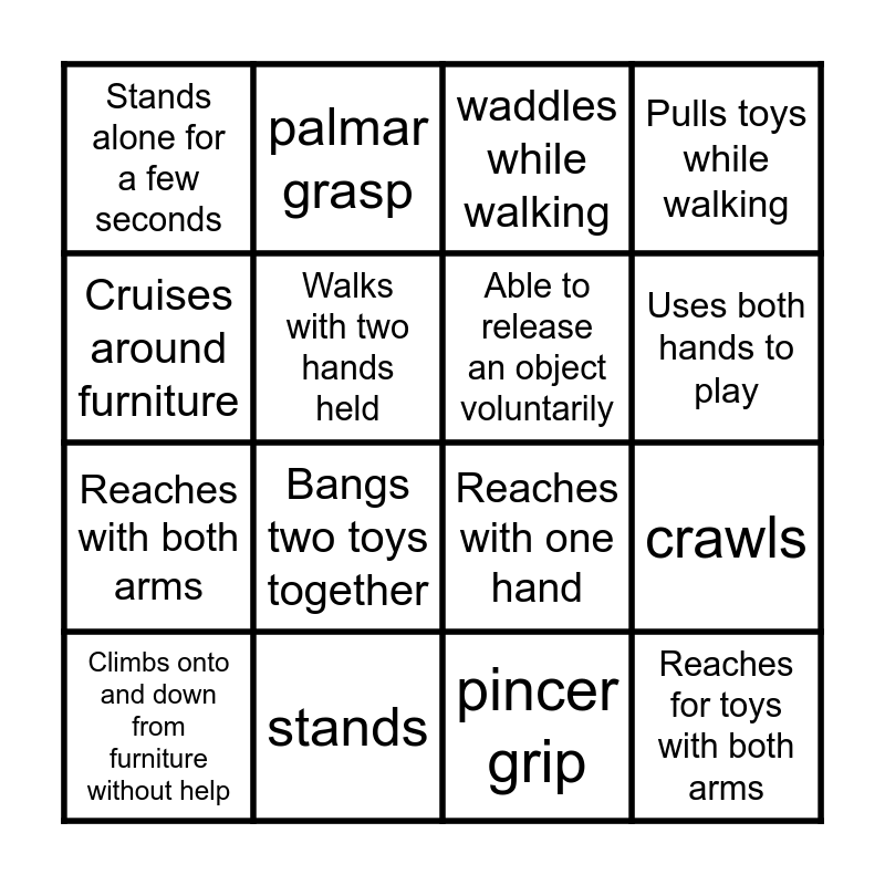 This bingo card has 16 words: stands, crawls, waddles while walking, Stands alone for a few seconds, Reaches with both arms, palmar grasp, Reaches with one hand, pincer grip, Cruises around furniture, Walks with two hands held, Climbs onto and down from furniture without help, Pulls toys while walking, Bangs two toys together, Uses both hands to play, Able to release an object voluntarily and Reaches for toys with both arms.