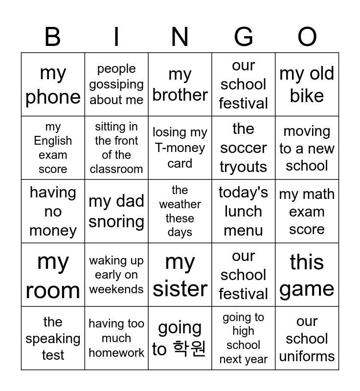 This bingo card has 30 words: having too much homework, losing my T-money card, my dad snoring, being bitten by mosquitoes, my phone, my brother, sitting in the front of the classroom, my sister, today's lunch menu, going to 학원, my math exam score, the weather these days, going to high school next year, our school uniforms, moving to a new school, the school playground, our school festival, my room, waking up early on weekends, my old bike, having no money, studying all day, people gossiping about me, the soccer tryouts, my English exam score, our school festival, this game, the speaking test, losing my T-money card and forgetting my friend's birthday.