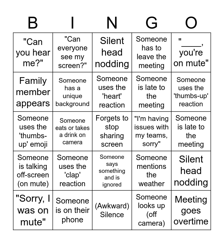 This bingo card has 25 words: Someone uses the 'clap' reaction, (Awkward) Silence, Someone uses the 'heart' reaction, "Sorry, I was on mute", "____, you're on mute", "Can you hear me?", Family member appears, "Can everyone see my screen?", "I'm having issues with my teams, sorry", Someone says something and is ignored, Someone is late to the meeting, Someone uses the 'thumbs-up' emoji, Someone mentions the weather, Silent head nodding, Someone has a unique background, Meeting goes overtime, Someone is late to the meeting, Silent head nodding, Someone uses the 'thumbs-up' reaction, Someone eats or takes a drink on camera, Forgets to stop sharing screen, Someone is on their phone, Someone is talking off-screen (on mute), Someone has to leave the meeting and Someone looks up (off camera).