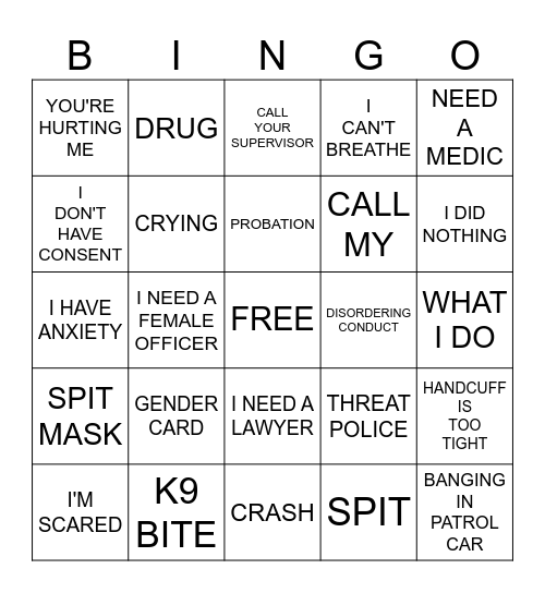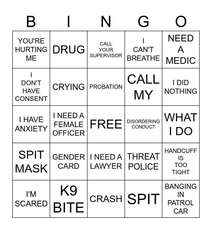 This bingo card has a free space and 59 words: TASER, K9 BITE, PEPPER SPRAY, SPIT MASK, SPIT, ASSAULT ON OFFICER, CRYING, HOGTIE, CALL MY, SOMEBODY RECORD VIDEO, I CAN'T BREATHE, RESIST, I DON'T HAVE CONSENT, I KNOW MY RIGHT, FLEEING, YOU'RE HURTING ME, BANGING IN PATROL CAR, NEED A MEDIC, I HAVE RIGHT TO KNOW, PROBATION, DISORDERING CONDUCT, CALL YOUR SUPERVISOR, I'M SCARED, HANDCUFF IS TOO TIGHT, WHY ARE YOU ARRESTING ME, THIS IS ILLEGAL, ARE YOU GOING TO ARREST ME, I HAVE KID, I DID NOTHING, CALL 911, I'M JUST TRYING TO GO HOME, I DON'T HAVE ID, WON'T PROVIDE NAME, HAS A WARRANT, DRUG, I'M PREGNANT, REPEAT SAME WORD, I NEED A FEMALE OFFICER, CRIMINAL RECORD, I HAVE ANXIETY, RACE CARD, GENDER CARD, WHAT I DO, THAT'S NOT MINE, SOBRIETY TEST, NAME AND BADGE NUMBER, DIDN'T ANSWER SIMPLE QUESTION, FAKE NAME, I NEED A LAWYER, CRASH, TVI/PIT, I DON'T DO DRUG, I DON'T HAVE DRINK, AM I FREE TO GO, I NEED A PHONE, THREAT POLICE, LIE, PROFANITY and HOMELESS.