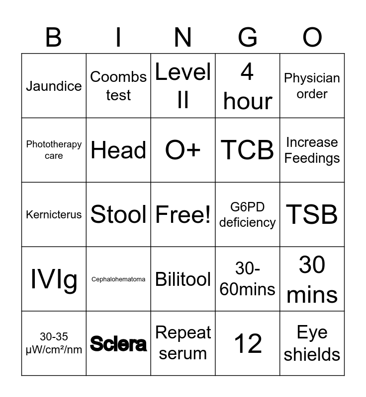This bingo card has a free space and 24 words: Cephalohematoma, Sclera, O+, 30-35 µW/cm²/nm, Physician order, Jaundice, Phototherapy care, Coombs test, G6PD deficiency, Bilitool, TCB, Kernicterus, 30-60mins, 30 mins, Head, 12, TSB, Level II, Increase Feedings, Stool, Eye shields, IVIg, 4 hour and Repeat serum.