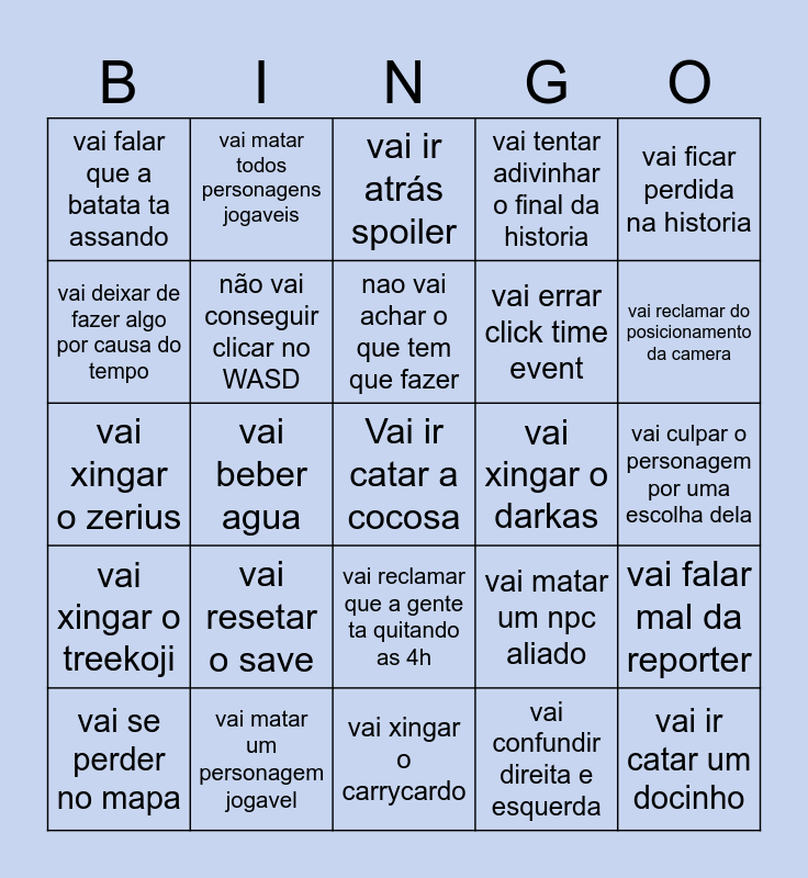 This bingo card has a free space and 24 words: vai resetar o save, vai matar um personagem jogavel, nao vai achar o que tem que fazer, vai se perder no mapa, vai ficar perdida na historia, vai falar que a batata ta assando, vai deixar de fazer algo por causa do tempo, vai matar todos personagens jogaveis, vai xingar o darkas, vai reclamar que a gente ta quitando as 4h, vai errar click time event, vai xingar o zerius, vai matar um npc aliado, vai falar mal da reporter, não vai conseguir clicar no WASD, vai confundir direita e esquerda, vai culpar o personagem por uma escolha dela, vai ir atrás spoiler, vai reclamar do posicionamento da camera, vai beber agua, vai ir catar um docinho, vai xingar o treekoji, vai tentar adivinhar o final da historia and vai xingar o carrycardo.