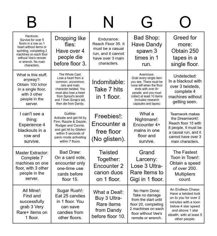 This bingo card has a free space and 24 words: Bad Draw: On a card vote, encounter only one-time use cards before floor 15., Sugar Rush!: Eat 25 candies in 1 floor. You can save candies from other floors., Indomitable: Take 7 hits in 1 floor., All Mine!: Find and successfully grab 3 Very Rare+ items on 1 floor., Greed for more: Obtain 250 tapes in a single floor., Hardcore: Survive for over 5 floors in a row on 1 heart without items or sprinting, completing 2 machines on each floor without Vee's remote or wrench. No main characters., What is this stuff, anyway?: Obtain 100 Ichor in a single floor, with 3 other people in the server., Dropping like flies: Have over 4 people die before floor 3., What a Nightmare!: Encounter 4+ mains in one floor and survive., Twisted Together: Encounter 2 canon duos on 1 floor., Avaricious: Grab every single item you see. There must be none left when the floor ends with over 8+ people, and you must collect at least 10 items (includes research capsules and tapes), I can't see a thing: Experience 4 blackouts in a row and survive., Grand Larceny: Lose 3 Ultra-Rare Items to Gigi in 1 floor., The Fastest Toon in Town!: Obtain a speed of over 200. Multipliers count., The Whole Cast: Lose a heart from a common, uncommon, rare and main character twisted. You must also lose a heart from Sprout's tendril and 1 from Scrap's tail, then die from Dandy., No Harm Done: Take no damage from the start until floor 20, completing 2 machines on each floor without Vee's remote or wrench., Teamwork makes the Dreamwork!: Reach floor 15 with 8 people. It must be a causal run, and it cannot have over 3 main characters., Endurance: Reach Floor 35. It must be a casual run, and it cannot have over 3 main characters., Undetected: In a blackout with over 3 twisteds, complete 4 machines without getting seen., Gullible: Activate and get hit by Finn, Razzle & Dazzle, Rodger and Connie, and get hit by Glisten within 5 seconds of panic mode activating within 7 floors., An Endless Chase: Have a twisted lock on to you for over 2 minutes with a toon below 4 star speed and above 1 star stealth, with at least 5 other people., Master Extractor: Complete 7 machines on one floor, with 3 other people in the server., Bad Shop: Have Dandy spawn 3 times in 1 run. and What a Deal!: Buy 3 Ultra-Rare items from Dandy before floor 10..