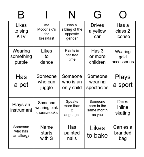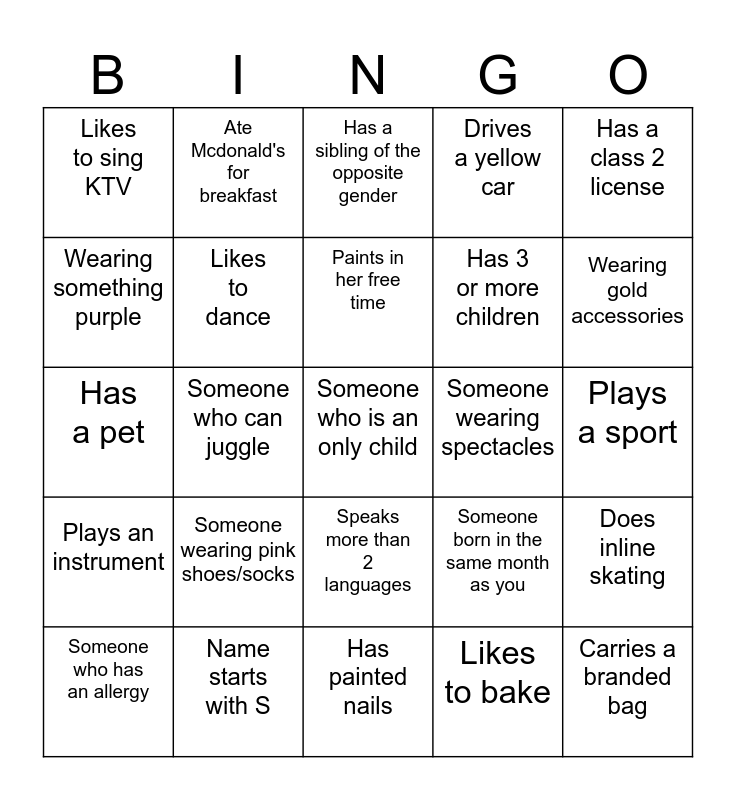 This bingo card has a free space and 24 words: Someone wearing pink shoes/socks, Name starts with S, Paints in her free time, Someone who has an allergy, Has a class 2 license, Likes to sing KTV, Wearing something purple, Ate Mcdonald's for breakfast, Someone wearing spectacles, Speaks more than 2 languages, Has 3 or more children, Has a pet, Someone born in the same month as you, Does inline skating, Likes to dance, Likes to bake, Plays a sport, Has a sibling of the opposite gender, Wearing gold accessories, Someone who can juggle, Carries a branded bag, Plays an instrument, Drives a yellow car and Has painted nails.