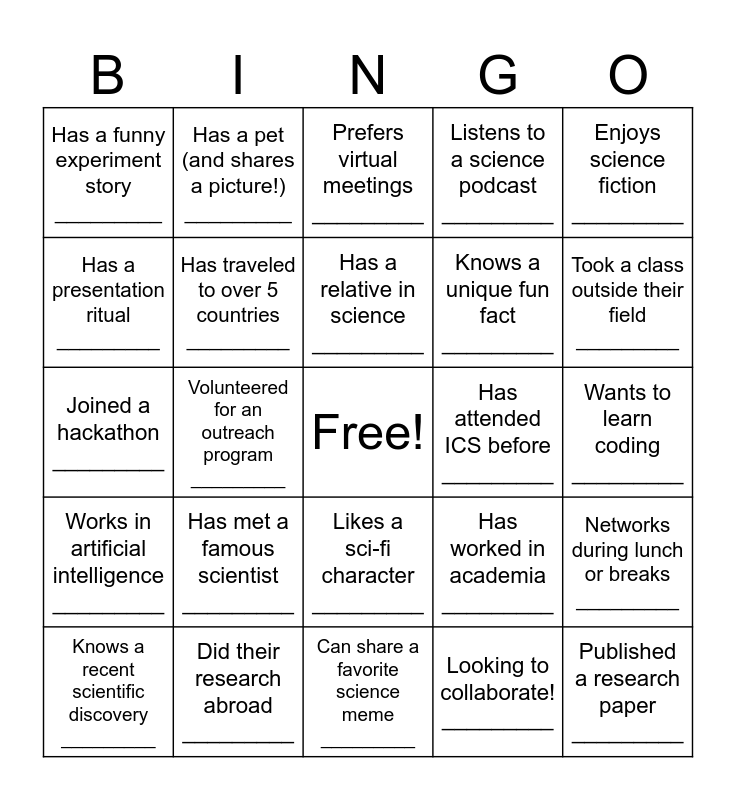 This bingo card has a free space and 24 words: Has met a famous scientist _________, Did their research abroad _________, Has a relative in science _________, Knows a recent scientific discovery _________, Enjoys science fiction _________, Has a funny experiment story _________, Has a presentation ritual _________, Has a pet (and shares a picture!) _________, Has attended ICS before _________, Likes a sci-fi character _________, Knows a unique fun fact _________, Joined a hackathon _________, Has worked in academia _________, Networks during lunch or breaks _________, Has traveled to over 5 countries _________, Looking to collaborate! _________, Wants to learn coding _________, Prefers virtual meetings _________, Took a class outside their field _________, Volunteered for an outreach program _________, Published a research paper _________, Works in artificial intelligence _________, Listens to a science podcast _________ and Can share a favorite science meme _________.