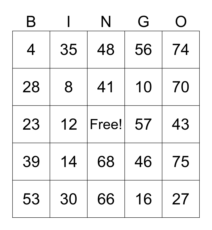 This bingo card has a free space and 24 words: 14, 30, 41, 53, 74, 4, 28, 35, 57, 68, 10, 23, 46, 75, 8, 16, 43, 48, 70, 12, 27, 39, 56 and 66.