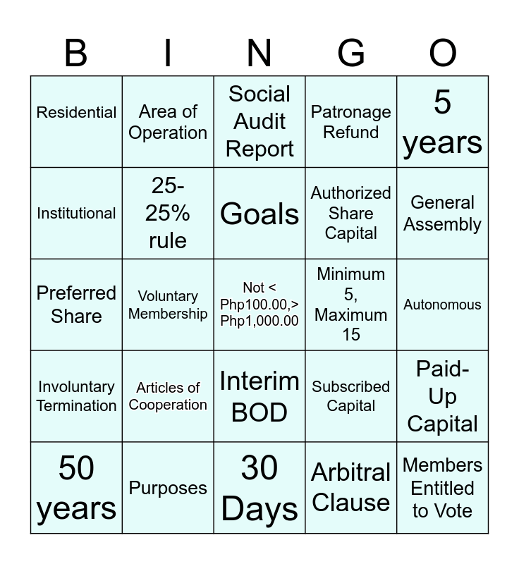 This bingo card has a free space and 24 words: Articles of Cooperation, Purposes, Goals, 50 years, 5 years, Residential, Institutional, Area of Operation, Minimum 5, Maximum 15, Interim BOD, Authorized Share Capital, Preferred Share, Subscribed Capital, Paid-Up Capital, 25-25% rule, Arbitral Clause, Autonomous, Social Audit Report, General Assembly, Voluntary Membership, Members Entitled to Vote, Involuntary Termination, Patronage Refund and 30 Days.