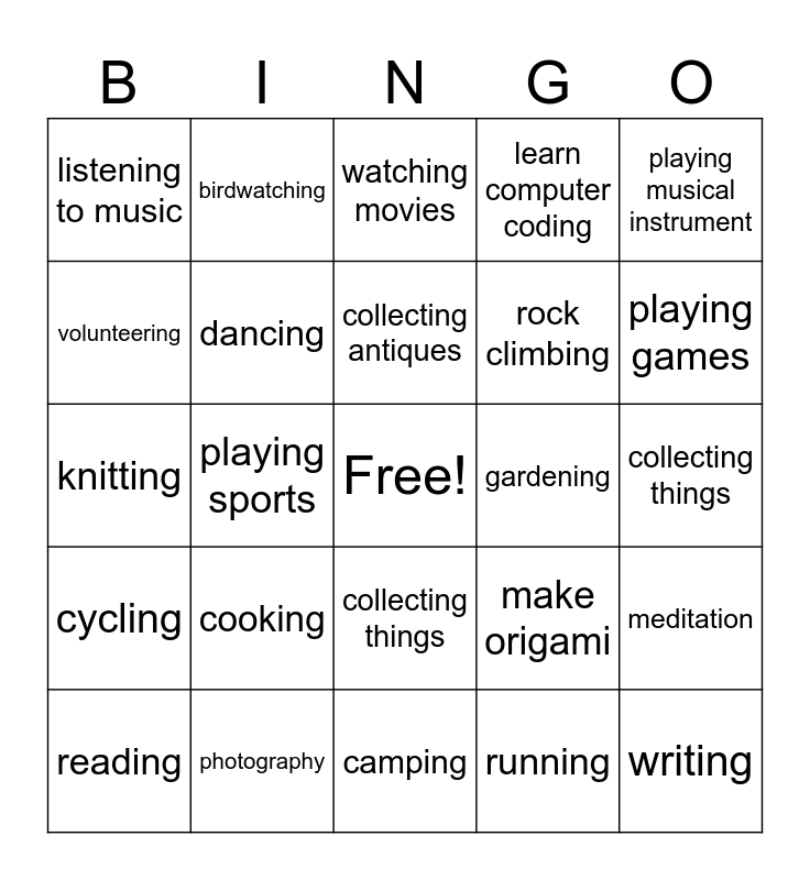 This bingo card has a free space and 29 words: reading, drawing, playing sports, doing yoga, listening to music, watching movies, dancing, cooking, gardening, photography, collecting things, writing, camping, running, playing games, traveling, collecting things, cycling, playing musical instrument, knitting, make origami, doing puzzles, rock climbing, volunteering, learn computer coding, birdwatching, meditation, collecting antiques and decorating.