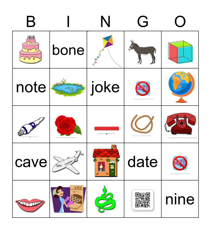 This bingo card has 22 images, a free space and 7 words: time, nine, cave, date, note, bone and joke.