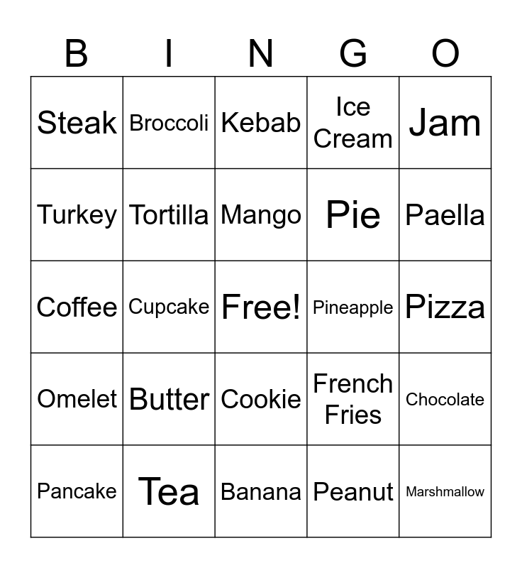 This bingo card has a free space and 31 words: Banana, Popcorn, Cupcake, Toast, Steak, Kebab, Tortilla, French Fries, Pineapple, Peanut, Pizza, Marshmallow, Yogurt, Fish, Paella, Carrot, Chocolate, Butter, Omelet, Cookie, Jam, Sushi, Pancake, Broccoli, Pie, Turkey, Ice Cream, Coffee, Tea, Mango and Lychee.