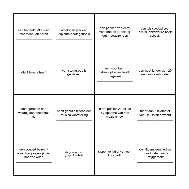 This bingo card has 28 words: een blaasinstrument kan spelen ____________________, ooit wildkamperen heeft geprobeerd ____________________, een optreden had waarbij een decorstuk viel ____________________, kent iemand die precies dezelfde naam heeft als hij/zij ____________________, van stemgroep is gewisseld ____________________, een poplied verkeerd verstond en jarenlang fout meegezongen ____________________, afgelopen jaar een diploma heeft gehaald ____________________, ooit tijdens een lied de draad helemaal is kwijtgeraakt ____________________, die je nog nooit gesproken hebt ______________________, naar een tributeconcert is geweest ____________________, in het publiek zat bij de TV-opname van een muziekshow ____________________, een reis speciaal voor een muziekervaring heeft geboekt ____________________, een muziekinstrument heeft maar niets mee doet ____________________, nooit meezingt in de auto ____________________, heeft gehuild tijdens een musicalvoorstelling ____________________, per ongeluk zijn/haar sleutels in de koelkast heeft gelegd ____________________, die minimaal 2 posters van zijn/haar popidool heeft ____________________, een spontaan straatoptreden heeft gegeven ____________________, een noot langer dan 25 sec. kan aanhouden ____________________, altijd te laat komt bij repetities ____________________, een bepaald MPD-lied niet meer kan horen ____________________, een heel seizoen van een serie in één weekend gebingewatcht ____________________, een concert bezocht waar hij/zij eigenlijk niet naartoe wilde ____________________, meer dan 8 kilometer van De Hofstee woont ____________________, kippenvel krijgt van een koorpartij ____________________, zelf een lied heeft geschreven ____________________, die 2 broers heeft ____________________ and je nog nooit gesproken hebt ____________________.