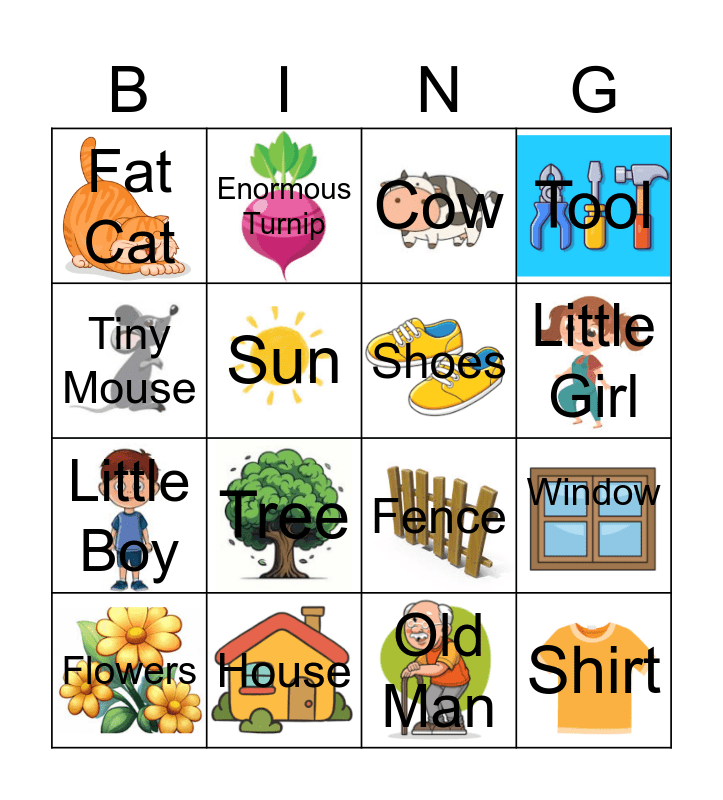 This bingo card has 16 images and 16 words: Flowers, House, Cow, Tool, Tiny Mouse, Enormous Turnip, Fence, Window, Fat Cat, Sun, Old Man, Little Girl, Little Boy, Tree, Shoes and Shirt.