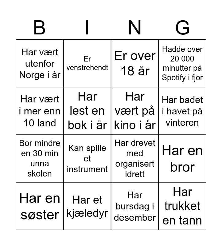 This bingo card has 16 words: Har et kjæledyr, Har en bror, Er over 18 år, Har vært utenfor Norge i år, Bor mindre en 30 min unna skolen, Er venstrehendt, Har drevet med organisert idrett, Har bursdag i desember, Har vært i mer enn 10 land, Har lest en bok i år, Har en søster, Hadde over 20 000 minutter på Spotify i fjor, Kan spille et instrument, Har badet i havet på vinteren, Har vært på kino i år and Har trukket en tann.