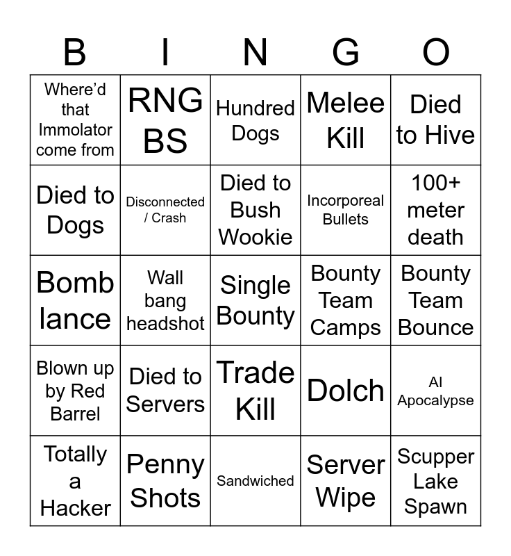 This bingo card has a free space and 24 words: Died to Servers, Penny Shots, Died to Bush Wookie, Totally a Hacker, Died to Hive, Where’d that Immolator come from, Died to Dogs, RNG BS, Bounty Team Camps, Trade Kill, Incorporeal Bullets, Bomb lance, Dolch, AI Apocalypse, Disconnected / Crash, Server Wipe, Bounty Team Bounce, Hundred Dogs, 100+ meter death, Wall bang headshot, Scupper Lake Spawn, Blown up by Red Barrel, Melee Kill and Sandwiched.