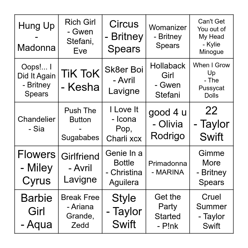 This bingo card has a free space and 49 words: Espresso - Sabrina Carpenter, Cruel Summer - Taylor Swift, HOT TO GO! - Chappell Roan, Style - Taylor Swift, Girlfriend - Avril Lavigne, Untouched - The Veronicas, Rich Girl - Gwen Stefani, Eve, Apple - Charli xcx, Oops!... I Did It Again - Britney Spears, Bad Romance - Lady Gaga, TiK ToK - Kesha, Womanizer - Britney Spears, Gimme More - Britney Spears, Primadonna - MARINA, Crazy In Love - Beyonce, JAY-Z, Disturbia - Rihanna, Sk8er Boi - Avril Lavigne, good 4 u - Olivia Rodrigo, LUNCH - Billie Eilish, Can't Get You out of My Head - Kylie Minogue, Push The Button - Sugababes, Get the Party Started - P!nk, Hung Up - Madonna, Hollaback Girl - Gwen Stefani, Murder On The Dancefloor - Sophie Ellis-Bextor, When I Grow Up - The Pussycat Dolls, Barbie Girl - Aqua, Messy - Lola Young, Genie In a Bottle - Christina Aguilera, Flowers - Miley Cyrus, Houdini - Dua Lipa, As It Was - Harry Styles, Please Please Please - Sabrina Carpenter, So What - P!nk, Break Free - Ariana Grande, Zedd, Diet Pepsi - Addison Rae, 360 - Charli xcx, Taste - Sabrina Carpenter, 22 - Taylor Swift, I Knew You Were Trouble - Taylor Swift, Poker Face - Lady Gaga, Hips Don't Lie - Shakira, Price Tag - Jessie J, B.o.B, thank u, next - Ariana Grande, Chandelier - Sia, Circus - Britney Spears, Pocketful of Sunshine - Natasha Bedingfield, Don't Cha - The Pussycat Dolls and Shower - Becky G.