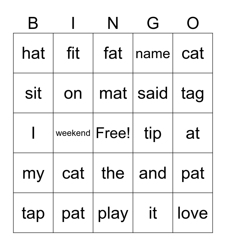 This bingo card has a free space and 24 words: cat, pat, mat, tap, cat, hat, sit, fit, tip, the, said, I, and, pat, on, it, at, fat, tag, weekend, love, my, name and play.