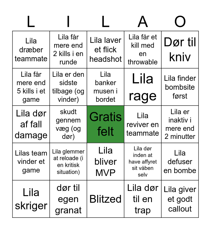 This bingo card has a free space and 29 words: Lila skriger, Lila dør som den første 3 runder i stræk, skudt gennem væg (og dør), Lila rammer mic (slår), Lila dræber teammate, Lila laver et flick headshot, Lila er den sidste tilbage (og vinder), Lila glemmer at reloade (i en kritisk situation), Lila reviver en teammate, dør til egen granat, Lila er inaktiv i mere end 2 minutter, Lila giver et godt callout, Blitzed, Lila dør til en trap, Lila finder bombsite først, Lila blir drabt af teammate, Lila bliver MVP, Lilas team vinder et game, Dør til kniv, Lila dør af fall damage, Lila dør inden at have affyret sit våben selv, Lila dør til gas, Lila rage, Lila får mere end 5 kills i et game, Lila får et kill med en throwable, Lila får mere end 2 kills i en runde, Lila defuser en bombe, Lila banker musen i bordet and Lila siger "GG".
