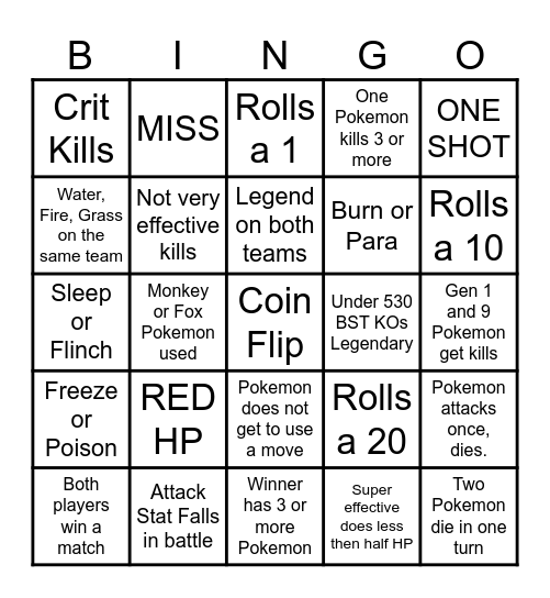 This bingo card has a free space and 24 words: RED HP, Attack Stat Falls in battle, Legend on both teams, Both players win a match, ONE SHOT, Crit Kills, Water, Fire, Grass on the same team, MISS, Under 530 BST KOs Legendary, Pokemon does not get to use a move, Burn or Para, Sleep or Flinch, Rolls a 20, Pokemon attacks once, dies., Not very effective kills, Super effective does less then half HP, Gen 1 and 9 Pokemon get kills, Rolls a 1, Rolls a 10, Monkey or Fox Pokemon used, Two Pokemon die in one turn, Freeze or Poison, One Pokemon kills 3 or more and Winner has 3 or more Pokemon.