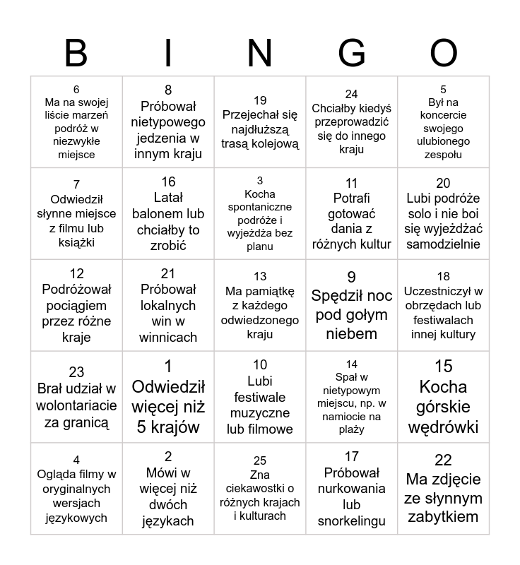 This bingo card has a free space and 24 words: 1 Odwiedził więcej niż 5 krajów, 2 Mówi w więcej niż dwóch językach, 3 Kocha spontaniczne podróże i wyjeżdża bez planu, 4 Ogląda filmy w oryginalnych wersjach językowych, 5 Był na koncercie swojego ulubionego zespołu, 6 Ma na swojej liście marzeń podróż w niezwykłe miejsce, 7 Odwiedził słynne miejsce z filmu lub książki, 8 Próbował nietypowego jedzenia w innym kraju, 9 Spędził noc pod gołym niebem, 10 Lubi festiwale muzyczne lub filmowe, 11 Potrafi gotować dania z różnych kultur, 12 Podróżował pociągiem przez różne kraje, 14 Spał w nietypowym miejscu, np. w namiocie na plaży, 15 Kocha górskie wędrówki, 16 Latał balonem lub chciałby to zrobić, 17 Próbował nurkowania lub snorkelingu, 18 Uczestniczył w obrzędach lub festiwalach innej kultury, 19 Przejechał się najdłuższą trasą kolejową, 20 Lubi podróże solo i nie boi się wyjeżdżać samodzielnie, 21 Próbował lokalnych win w winnicach, 22 Ma zdjęcie ze słynnym zabytkiem, 23 Brał udział w wolontariacie za granicą, 24 Chciałby kiedyś przeprowadzić się do innego kraju and 25 Zna ciekawostki o różnych krajach i kulturach.