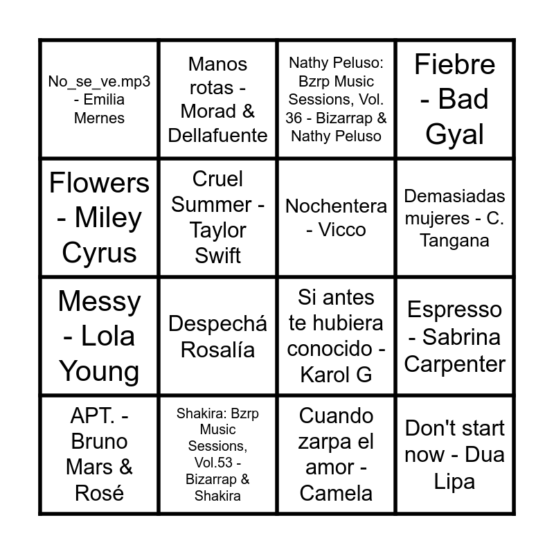 This bingo card has 32 words: The show must go on - Queen, Coti x Coti - The Tyets, Cuando zarpa el amor - Camela, Dance Monkey - Tones and I, APT. - Bruno Mars & Rosé, Cruel Summer - Taylor Swift, Nathy Peluso: Bzrp Music Sessions, Vol. 36 - Bizarrap & Nathy Peluso, Rockstar - Post Malone & 21 Savage, Flowers - Miley Cyrus, DtFM - Bad Bunny, Nochentera - Vicco, Fiebre - Bad Gyal, Lo que tiene - Morad, Beny Jr. & Rvfv, Como Camarón - Estopa, Macarena - Los del Río, 1000COSAS - Lola Índigo & Manuel Turizo, Mon amour Remix - Aitana & Zzoilo, Despechá Rosalía, Tacones rojos - Sebastián Yatra, Don't start now - Dua Lipa, Bulería - David Bisbal, Bad Romance - Lady Gaga, Summertime Sadness - Lana del Rey, Birds of feather - Billie Eilish, Messy - Lola Young, Manos rotas - Morad & Dellafuente, Si antes te hubiera conocido - Karol G, Demasiadas mujeres - C. Tangana, No_se_ve.mp3 - Emilia Mernes, Shakira: Bzrp Music Sessions, Vol.53 - Bizarrap & Shakira, Believer - Imagine Dragons and Espresso - Sabrina Carpenter.