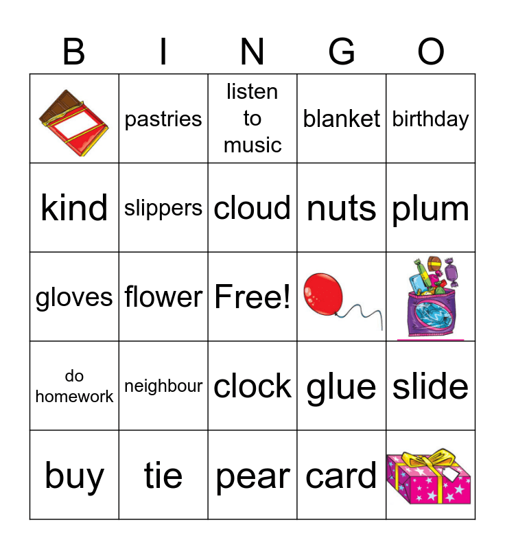 This bingo card has 4 images, a free space and 20 words: neighbour, tie, cloud, buy, birthday, kind, pastries, clock, nuts, gloves, glue, slide, slippers, card, listen to music, plum, flower, do homework, blanket and pear.
