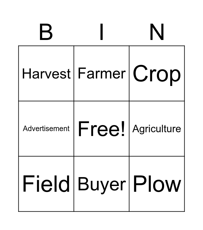 This bingo card has a free space and 8 words: Agriculture, Crop, Farmer, Field, Harvest, Plow, Advertisement and Buyer.