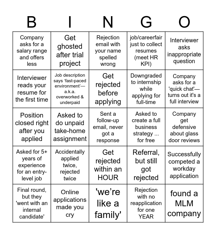 This bingo card has 26 words: Get rejected within an HOUR, Rejection with no reapplication for one YEAR, Get rejected before applying, Online applications made you cry, Interviewer asks inappropriate question, Company asks for a salary range and offers less, Interviewer reads your resume for the first time, Get ghosted after trial project, Company get defensive about glass door reviews, Referral, but still got rejected, Downgraded to internship while applying for full-time, Position closed right after you applied, Successfully competed a workday application, Final round, but they 'went with an internal candidate', Asked to do unpaid take-home assignment, Job description vs. interview expectations don't match, job/careerfair just to collect resumes (meet HR KPI), Asked for 5+ years of experience for an entry-level job, Rejection email with your name spelled wrong, Sent a follow-up email, never got a response, Company asks for a 'quick chat'—turns out it's a full interview, 'we’re like a family', Asked to create a full business strategy ... for free, Accidentally applied twice, rejected twice, Job description says ‘fast-paced environment’—a.k.a. overworked & underpaid and found a MLM company.