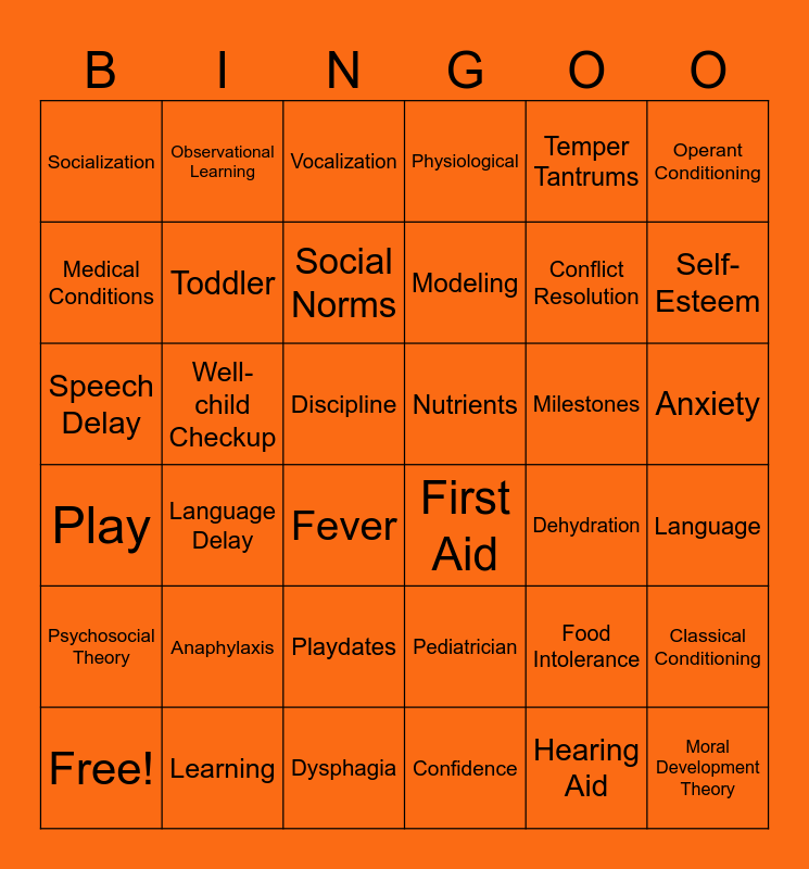 This bingo card has 42 words: Hearing Aid, Toddler, Development, Milestones, Language, Language Delay, Speech Delay, Speech Therapy, Vocalization, Anxiety, Discipline, Modeling, Self-Esteem, Temper Tantrums, Learning, Play, Classical Conditioning, Conflict Resolution, Moral Development Theory, Observational Learning, Operant Conditioning, Playdates, Psychosocial Theory, Socialization, Social Learning Theory, Free!, Social Norms, Nutrition, Anaphylaxis, Food Intolerance, Growth Chart, Nutrients, Medical Conditions, Dehydration, Dysphagia, Fever, First Aid, Well-child Checkup, Pediatrician, Confidence, Physiological and Free!.
