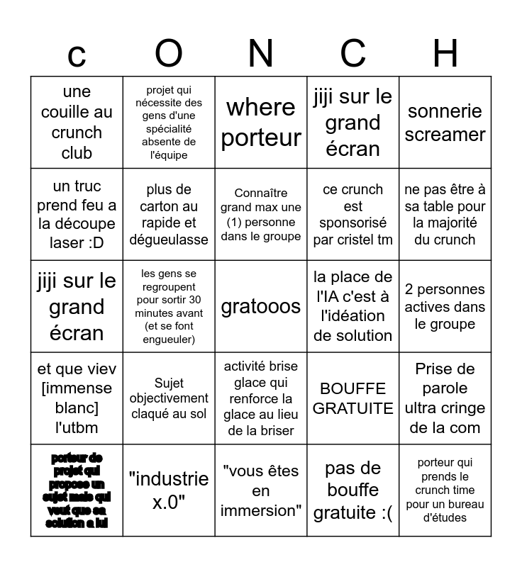 This bingo card has a free space and 24 words: Sujet objectivement claqué au sol, "industrie x.0", Connaître grand max une (1) personne dans le groupe, porteur de projet qui propose un sujet mais qui veut que sa solution a lui, sonnerie screamer, une couille au crunch club, un truc prend feu a la découpe laser :D, projet qui nécessite des gens d'une spécialité absente de l'équipe, la place de l'IA c'est à l'idéation de solution, activité brise glace qui renforce la glace au lieu de la briser, ce crunch est sponsorisé par cristel tm, jiji sur le grand écran, BOUFFE GRATUITE, Prise de parole ultra cringe de la com, plus de carton au rapide et dégueulasse, pas de bouffe gratuite :(, 2 personnes actives dans le groupe, where porteur, ne pas être à sa table pour la majorité du crunch, les gens se regroupent pour sortir 30 minutes avant (et se font engueuler), porteur qui prends le crunch time pour un bureau d'études, et que viev [immense blanc] l'utbm, jiji sur le grand écran and "vous êtes en immersion".