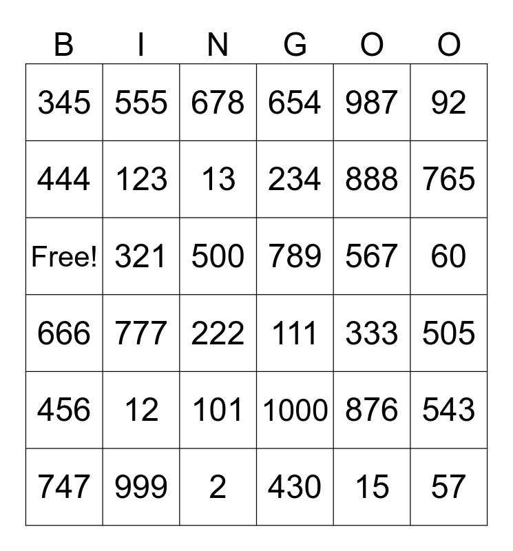 This bingo card has 36 words: 1000, 101, 430, 444, 666, 789, 123, 2, 987, 876, 765, 654, 543, 321, 234, 345, 456, 567, Free!, 678, 500, 777, 111, 222, 333, 555, 888, 999, 13, 92, 57, 747, 505, 60, 12 and 15.