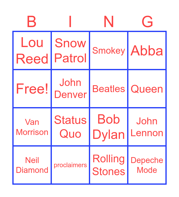This bingo card has 16 words: proclaimers, John Lennon, Smokey, Lou Reed, Van Morrison, Snow Patrol, Bob Dylan, Rolling Stones, Free!, John Denver, Neil Diamond, Abba, Status Quo, Queen, Beatles and Depeche Mode.
