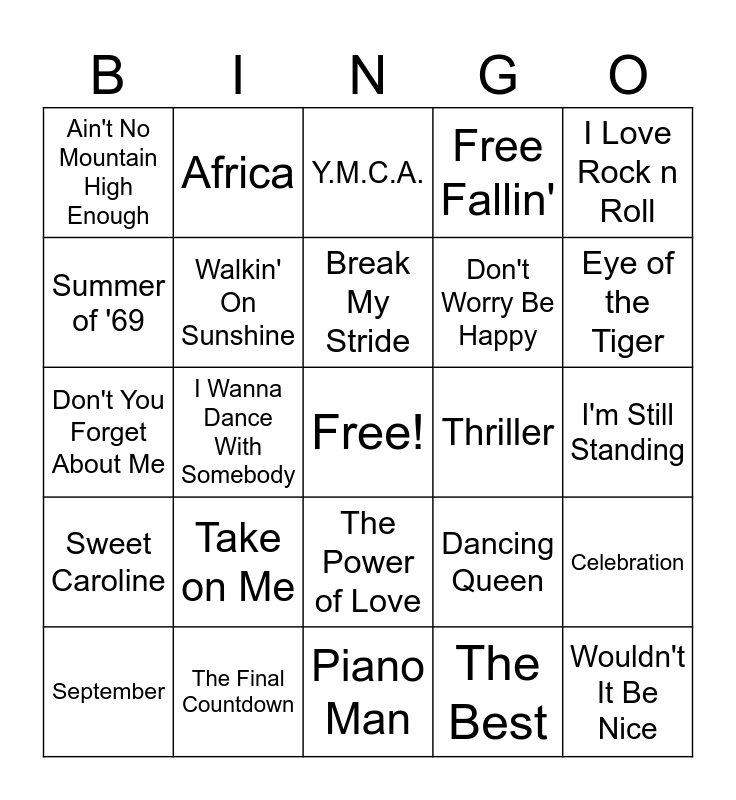 This bingo card has a free space and 24 words: Take on Me, The Final Countdown, Break My Stride, September, I Love Rock n Roll, Ain't No Mountain High Enough, Summer of '69, Africa, Thriller, The Power of Love, Don't Worry Be Happy, Don't You Forget About Me, Dancing Queen, Celebration, Walkin' On Sunshine, The Best, I'm Still Standing, Y.M.C.A., Eye of the Tiger, I Wanna Dance With Somebody, Wouldn't It Be Nice, Sweet Caroline, Free Fallin' and Piano Man.