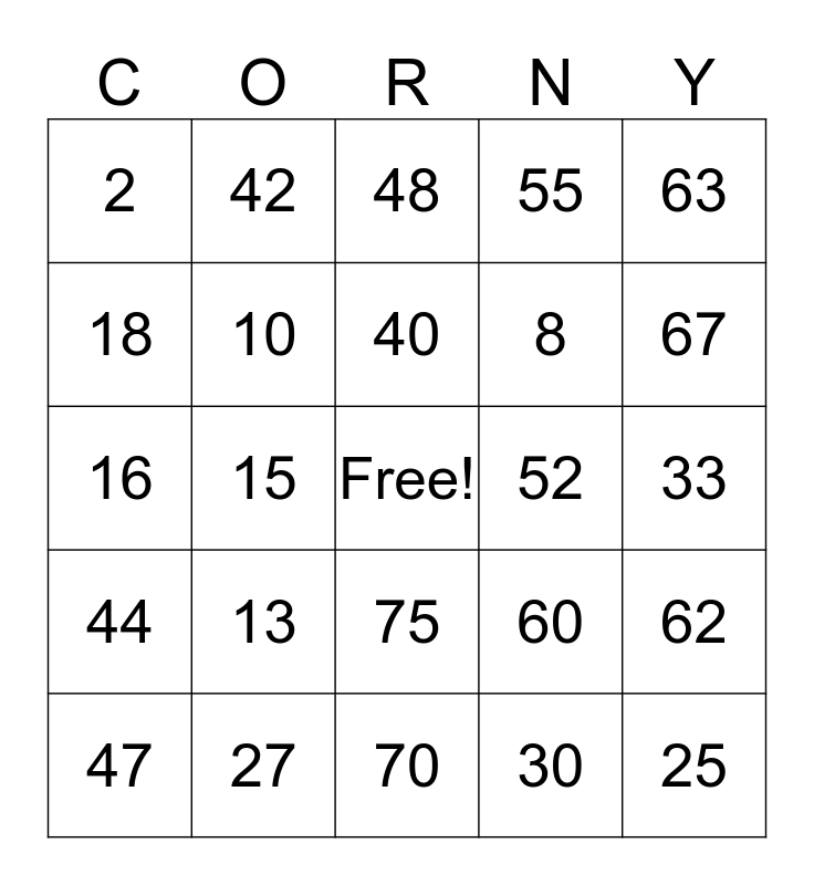 This bingo card has a free space and 24 words: 13, 27, 40, 47, 63, 2, 18, 42, 52, 75, 8, 16, 60, 62, 10, 30, 33, 48, 67, 15, 25, 44, 55 and 70.