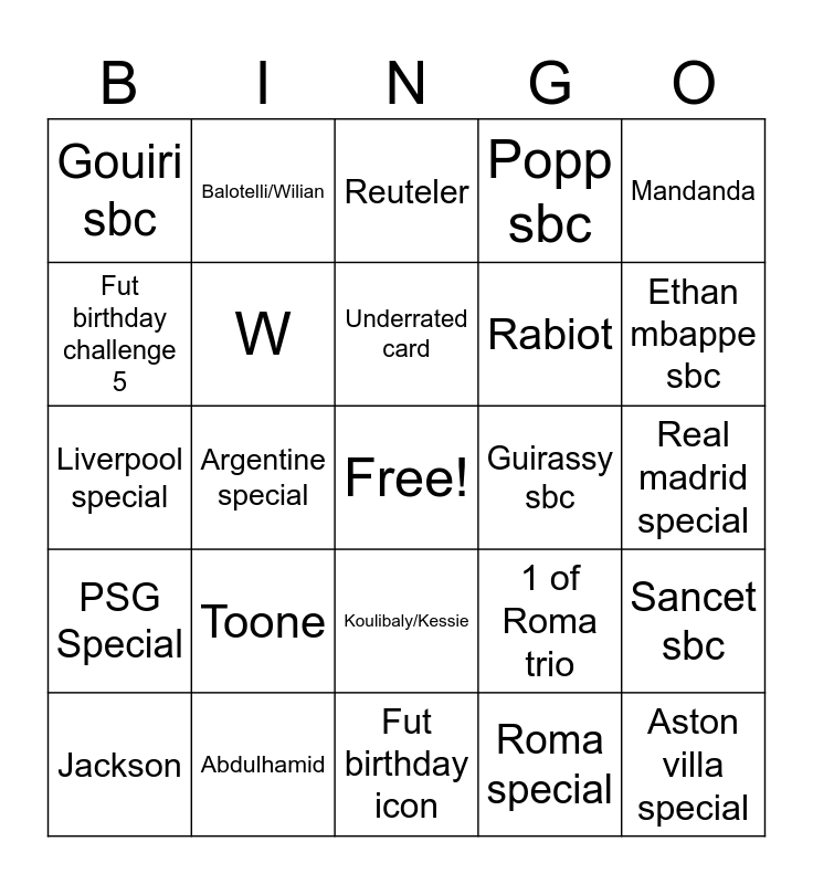 This bingo card has a free space and 94 words: any Fut birthday, Fut birthday 91+, Fut birthday icon, Fut birthday Hero, Antony, Nunez, Maguire, Jackson, TOTW, 200k +, 500k +, Semenyo, Isco, Rabiot, Nusa, Mandanda, Reuteler, Acosta, Wubben-Moy, Paredes, Zubimendi, Cascarino, Zaha, Antonia silva, Toone, W, Team upgrade, Objective card, SBC card, 1 mil+, Abdulhamid, Koulibaly/Kessie, Hummels/Florenzi, Kone/Jones, Balotelli/Wilian, Capdevilla/Nakata, Kimpembe/Renato sanchez, Al owairan/packs, Underrated card, 1 of Roma trio, Liverpool special, PSG Special, Real madrid special, Atletico madrid special, Aston villa special, Dortmund special, Barca special, Arsenal special, Inter special, Milan special, Juventus special, Roma special, Bayern special, Eredivisie special, Liga portugal special, Italian special, Dutch special, French special, English special, German special, Argentine special, Brazil special, Spain special, Manager rises to at least 2500, W from campaign mix, W from Icon mix, W from Hero mix, Fut birthday challenge 4, Fut birthday challenge 5, Rodman SBC, Salah SBC, Kolo muani sbc, Tevez sbc, Da costa sbc, Popp sbc, Tabsoba sbc, Pope sbc, Ethan mbappe sbc, Sancet sbc, Suarez sbc, Monday sbc, Scott sbc, Futre sbc, Guirassy sbc, Gouiri sbc, Bergkamp sbc, Kluivert sbc, Van persie sbc, Pirlo sbc, City special, Chelsea special, Spurs special, Man u special and Fut gg trending.