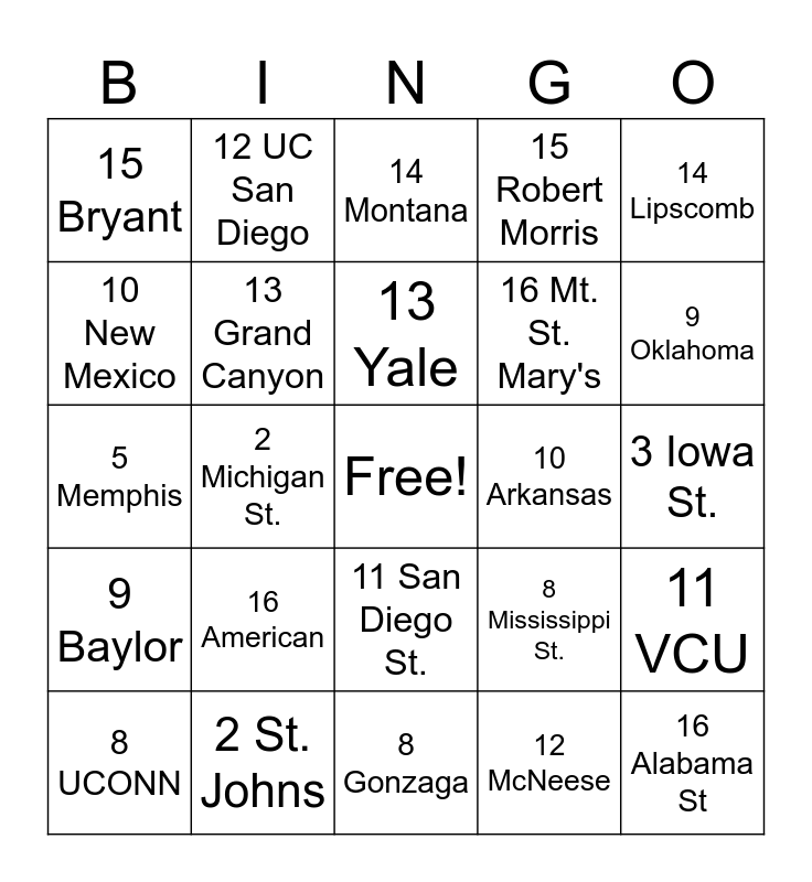 This bingo card has a free space and 68 words: 1 Auburn, 16 Alabama St, 16 St. Francis PA, 8 Louisville, 9 Creighton, 5 Michigan, 12 UC San Diego, 4 Texas A&M, 13 Yale, 6 Ole Miss, 11 San Diego St., 11 North Carolina, 3 Iowa St., 14 Lipscomb, 7 Marquette, 10 New Mexico, 2 Michigan St., 15 Bryant, 1 Duke, 16 American, 16 Mt. St. Mary's, 8 Mississippi St., 9 Baylor, 5 Oregon, 12 Liberty, 4 Arizona, 13 Akron, 6 BYU, 11 VCU, 3 Wisconsin, 14 Montana, 7 St. Mary's, 10 Vanderbilt, 2 Alabama, 15 Robert Morris, 1 Florida, 16 Norfolk St., 8 UCONN, 9 Oklahoma, 5 Memphis, 12 Colorado St., 4 Maryland, 13 Grand Canyon, 6 Missouri, 11 Drake, 3 Texas Tech, 14 UNC Wilmington, 7 Kansas, 10 Arkansas, 2 St. Johns, 15 Omaha, 1 Houston, 16 SIUE, 8 Gonzaga, 9 Georgia, 5 Clemson, 12 McNeese, 4 Purdue, 13 High Point, 6 Illinois, 11 Texas, 11 Xavier, 3 Kentucky, 14 Troy, 7 UCLA, 10 Utah State, 2 Tennessee and 15 Wofford.