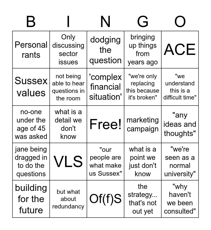 This bingo card has a free space and 24 words: VLS, but what about redundancy, 'complex financial situation', building for the future, ACE, Personal rants, Sussex values, Only discussing sector issues, marketing campaign, "our people are what make us Sussex", "we're only replacing this because it's broken", no-one under the age of 45 was asked, what is a point we just don't know, "we're seen as a normal university", not being able to hear questions in the room, the strategy... that's not out yet, "any ideas and thoughts", dodging the question, "we understand this is a difficult time", what is a detail we don't know, "why haven't we been consulted", jane being dragged in to do the questions, bringing up things from years ago and Of(f)S.