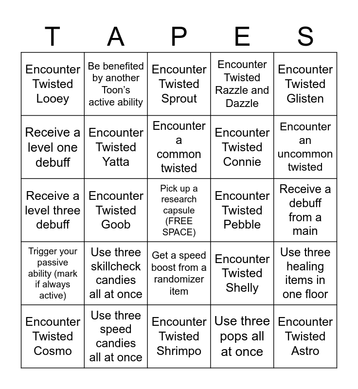 This bingo card has a free space and 57 words: Encounter Twisted Boxten, Encounter Twisted Cosmo, Encounter Twisted Poppy, Encounter Twisted Looey, Encounter Twisted Shrimpo, Encounter Twisted Tisha, Encounter Twisted Yatta, Encounter Twisted Brightney, Encounter Twisted Connie, Encounter Twisted Finn, Encounter Twisted Razzle and Dazzle, Encounter Twisted Rodger, Encounter Twisted Teagan, Encounter Twisted Toodles, Encounter Twisted Flutter, Encounter Twisted Gigi, Encounter Twisted Glisten, Encounter Twisted Goob, Encounter Twisted Scraps, Encounter Twisted Astro, Encounter Twisted Pebble, Encounter Twisted Vee, Encounter Twisted Shelly, Encounter Twisted Sprout, Encounter Twisted Dandy, Encounter a common twisted, Encounter two common twisteds on one floor, Encounter three common twisteds on one floor, Encounter an uncommon twisted, Encounter two uncommon twisteds on one floor, Encounter a rare twisted, Encounter two rare twisteds on one floor, Encounter a main, Receive a debuff from an ability or Finn, Receive a debuff from a main, Receive a level one debuff, Receive a level two debuff, Receive a level three debuff, Use your active ability (do not mark if you do not have an active), Trigger your passive ability (mark if always active), Be benefited by another Toon’s active ability, Get a speed boost from a randomizer item, Use nine gumballs all at once, Use three jawbreakers all at once, Use three stealth candies all at once, Use three extraction candies all at once, Use three skillcheck candies all at once, Use three speed candies all at once, Use three chocolate bars all at once, Use three stamina candies all at once, Use three protein bars all at once, Use three pops all at once, Use three boxes of chocolate all at once, Use three stealth candies all at once and run through the distractor, “Veemote” a machine using jumper cables, Use three healing items in one floor and Use a pop or bottle of pop to refill your stamina from 15 or lower to escape a twisted, without taking damage.