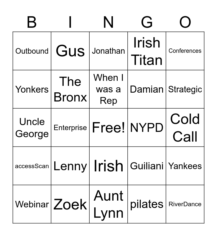 This bingo card has a free space and 24 words: Lenny, Zoek, When I was a Rep, Webinar, Conferences, Outbound, Yonkers, Gus, NYPD, Irish, Damian, Uncle George, Guiliani, Yankees, The Bronx, pilates, Cold Call, Jonathan, Strategic, Enterprise, RiverDance, accessScan, Irish Titan and Aunt Lynn.