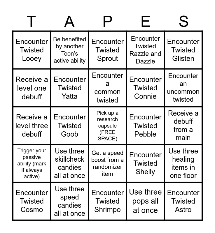This bingo card has a free space and 57 words: Encounter Twisted Boxten, Encounter Twisted Cosmo, Encounter Twisted Poppy, Encounter Twisted Looey, Encounter Twisted Shrimpo, Encounter Twisted Tisha, Encounter Twisted Yatta, Encounter Twisted Brightney, Encounter Twisted Connie, Encounter Twisted Finn, Encounter Twisted Razzle and Dazzle, Encounter Twisted Rodger, Encounter Twisted Teagan, Encounter Twisted Toodles, Encounter Twisted Flutter, Encounter Twisted Gigi, Encounter Twisted Glisten, Encounter Twisted Goob, Encounter Twisted Scraps, Encounter Twisted Astro, Encounter Twisted Pebble, Encounter Twisted Vee, Encounter Twisted Shelly, Encounter Twisted Sprout, Encounter Twisted Dandy, Encounter a common twisted, Encounter two common twisteds on one floor, Encounter three common twisteds on one floor, Encounter an uncommon twisted, Encounter two uncommon twisteds on one floor, Encounter a rare twisted, Encounter two rare twisteds on one floor, Encounter a main, Receive a debuff from an ability or Finn, Receive a debuff from a main, Receive a level one debuff, Receive a level two debuff, Receive a level three debuff, Use your active ability (do not mark if you do not have an active), Trigger your passive ability (mark if always active), Be benefited by another Toon’s active ability, Get a speed boost from a randomizer item, Use nine gumballs all at once, Use three jawbreakers all at once, Use three stealth candies all at once, Use three extraction candies all at once, Use three skillcheck candies all at once, Use three speed candies all at once, Use three chocolate bars all at once, Use three stamina candies all at once, Use three protein bars all at once, Use three pops all at once, Use three boxes of chocolate all at once, Use three stealth candies all at once and run through the distractor, “Veemote” a machine using jumper cables, Use three healing items in one floor and Use a pop or bottle of pop to refill your stamina from 15 or lower to escape a twisted, without taking damage.
