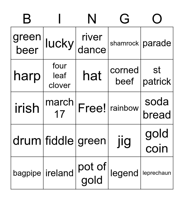 This bingo card has a free space and 24 words: fiddle, ireland, hat, bagpipe, parade, green beer, harp, lucky, rainbow, green, corned beef, irish, jig, gold coin, four leaf clover, legend, soda bread, river dance, st patrick, march 17, leprechaun, drum, shamrock and pot of gold.