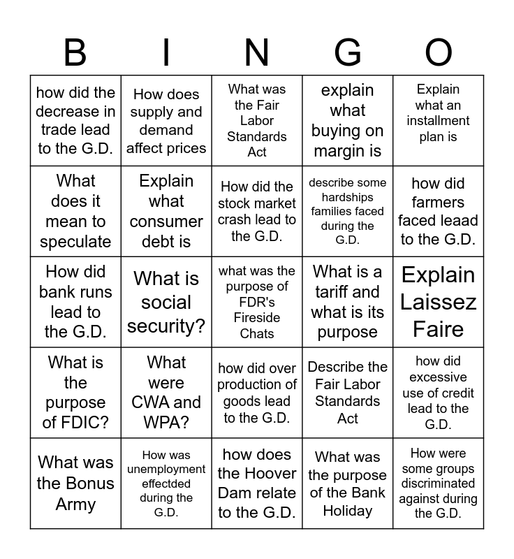 This bingo card has 25 words: What were CWA and WPA?, how does the Hoover Dam relate to the G.D., How did the stock market crash lead to the G.D., What was the Bonus Army, Explain what an installment plan is, how did the decrease in trade lead to the G.D., What does it mean to speculate, How does supply and demand affect prices, What is a tariff and what is its purpose, how did over production of goods lead to the G.D., describe some hardships families faced during the G.D., How did bank runs lead to the G.D., Describe the Fair Labor Standards Act, how did excessive use of credit lead to the G.D., Explain what consumer debt is, How were some groups discriminated against during the G.D., Explain Laissez Faire, What was the Fair Labor Standards Act, how did farmers faced leaad to the G.D., What is social security?, what was the purpose of FDR's Fireside Chats, How was unemployment effectded during the G.D., What is the purpose of FDIC?, explain what buying on margin is and What was the purpose of the Bank Holiday.
