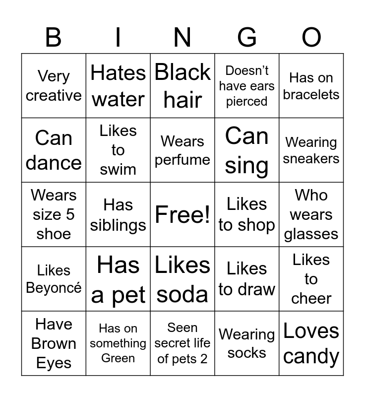 This bingo card has a free space and 29 words: Have Brown Eyes, Has ears pierced, Has siblings, Lives in a house, Very creative, Black hair, Likes to swim, Has a pet, Likes to shop, Has on something Green, Who wears glasses, Loves candy, Seen secret life of pets 2, Wearing socks, Wearing sneakers, Watched Disney channel, Likes soda, Likes Beyoncé, Has on bracelets, Wears size 5 shoe, Likes to draw, Eats chocolate, Can sing, Can dance, Doesn’t have ears pierced, Hates water, Likes to cheer, Wears perfume and Hair is colored.